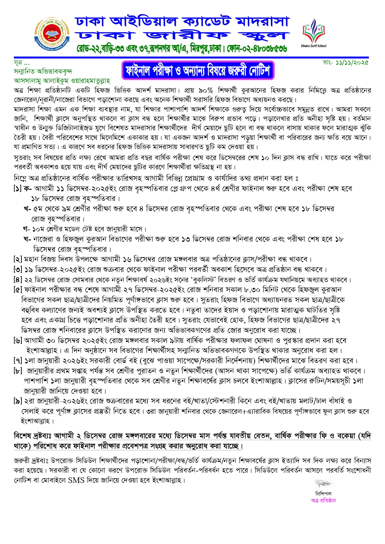 ফাইনাল পরীক্ষা, ভর্তি, বন্ধ ও নতুন শিক্ষাবর্ষের কার্যক্রম সূচী সম্পর্কে |